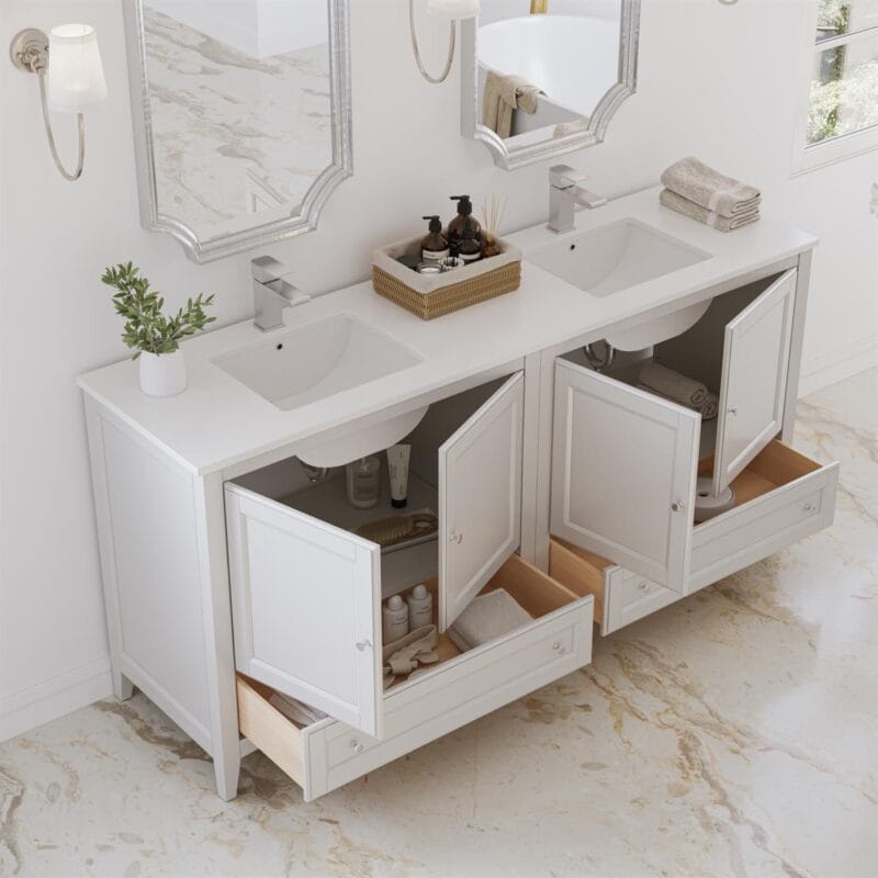 Try this: Upgrade to a modern design like the Amberly 60″ Matte Black Vanity for a sleek, 2025-ready look.