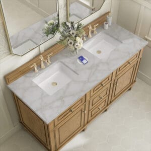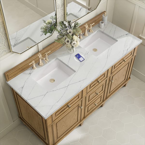 The 60″ Lorelai Double Vanity celebrates timeless form and exquisite finish details, combined with practical function. The Light Natural Oak finish is accented by reeded details, and clean, raised picture frame molding. Coin-edge knobs in Champagne Brass provide the perfect accent.