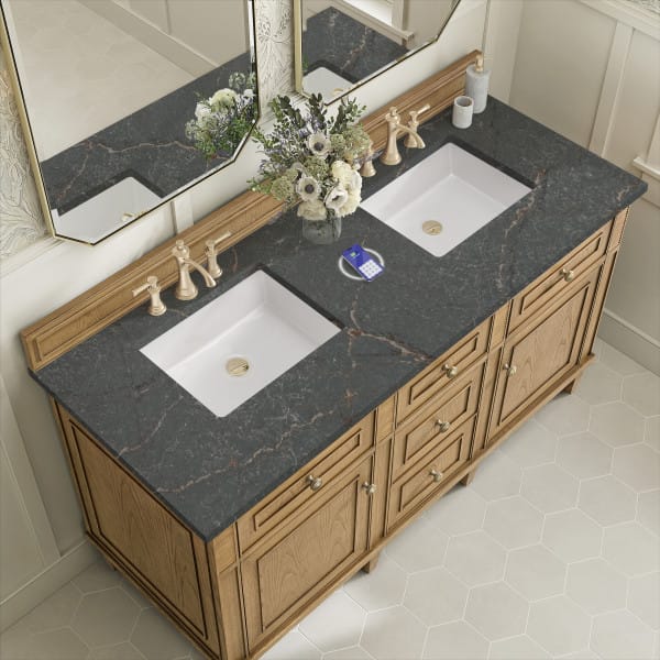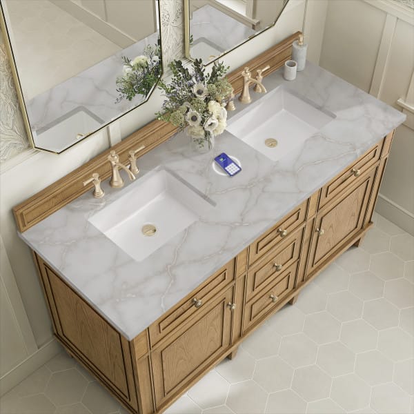 The 60″ Lorelai Double Vanity celebrates timeless form and exquisite finish details, combined with practical function. The Light Natural Oak finish is accented by reeded details, and clean, raised picture frame molding. Coin-edge knobs in Champagne Brass provide the perfect accent. This two-door cabinet opens to spacious interior with shelves and convenient USB/Electric power outlets. 3 traditional drawers and 2 tip-outs offer additional storage space. Choose one of our 3 cm tops with undermount, rectangular sinks to perfectly complete this masterpiece.