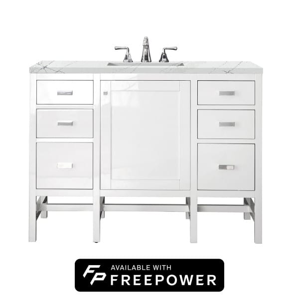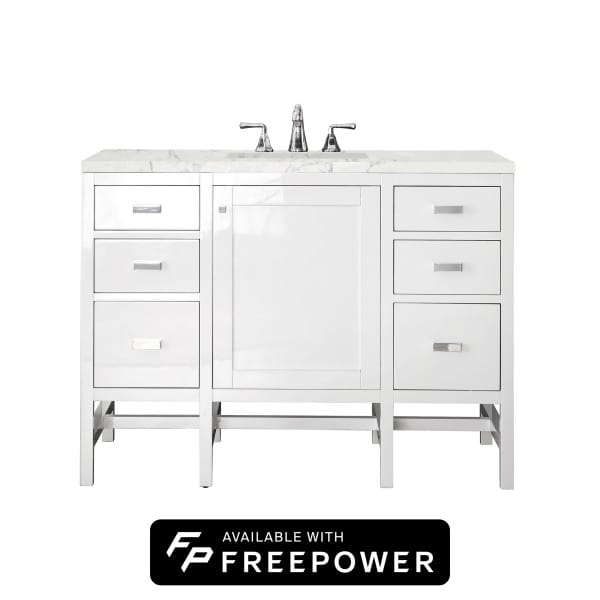 The Addison Modular Collection 48-in. Free-standing Vanity in Glossy White by James Martin Vanities lends a fresh take on Shaker-inspired design with a look of luxury.
