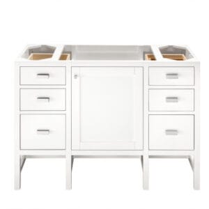 The Addison Collection 48-in. Free-standing Vanity by James Martin Vanities comes inyour choice of two finishes,lending a fresh take on Shaker-inspired design with a look of luxury. Handcrafted and gender-neutral, it fits effortlessly into modern or transitional rooms. The Shaker touch comes from the sides, drawers, and door. Each of the drawers feature full extensions with a undermounted slides as well as a brushed aluminum finished laminate that goes on the bottom of the drawer for easy clean up and like the door has a soft-close. The body of the cabinet is made of solid hardwood and sturdy panels of MDF. You will find this beautiful cabinet will complement any of the James Martin Vanity tops offered allowing you to pick the statement top that works for you!
