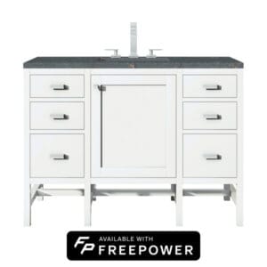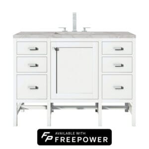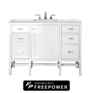 The Addison Modular Collection 48-in. Free-standing Vanity in Glossy White by James Martin Vanities lends a fresh take on Shaker-inspired design with a look of luxury.