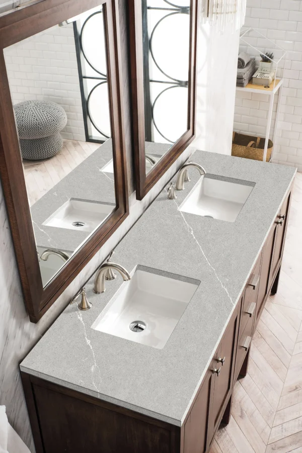 The Addison Modular Collection 72-in. Free-standing Double Vanity in Mid-Century Acacia by James Martin Vanities lends a fresh take on Shaker-inspired design with a look of luxury.