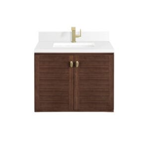 The 30″ Amberly single vanity celebrates Mid-Century simplistic forms and finish details combined with practical function. The beauty of the natural grains in the Walnut veneer steals the show, while the decorative, oval knobs in Champagne Brass provide the perfect accent. This two-door cabinet opens to a spacious interior with a single shelf and a convenient USB/Electric power outlet. The elegant wood base elevates the vanity cabinet in a true console style, though you may choose the more modern, space-saving wall-mount option.