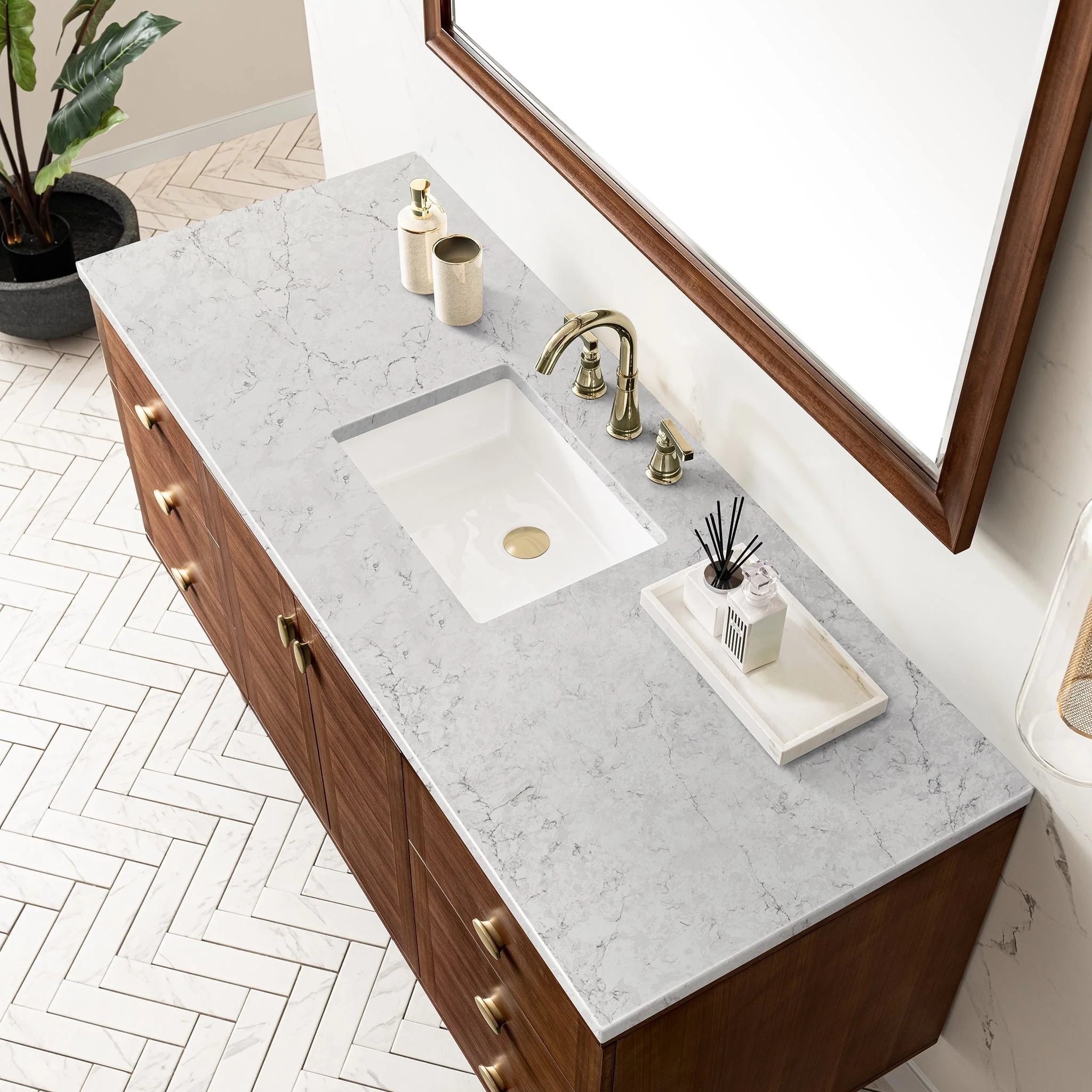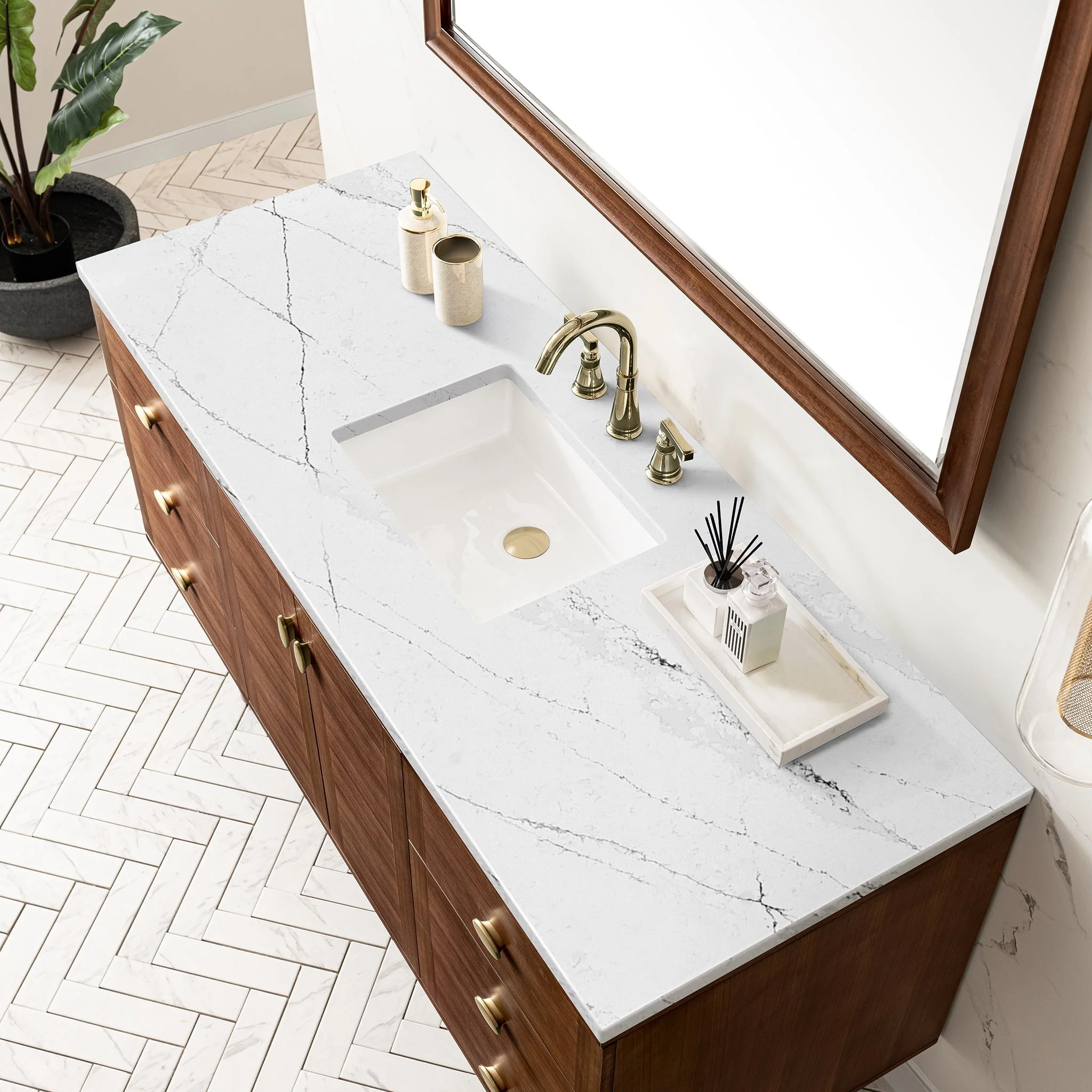 The 60″ Amberly single vanity celebrates Mid-Century simplistic forms and finish details combined with practical function. The beauty of the natural grains in the walnut veneer steals the show, while the decorative, oval knobs in Champagne Brass provide the perfect accent.