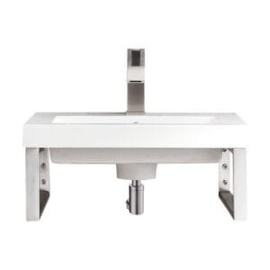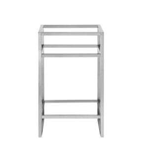 The Boston 20-in Stainless Steel Console in Brushed Nickel by James Martin Vanities is a beautiful small space solution vanity that will work well in any powder room. This space-conscious console is crafted with a durable stainless-steel base, giving you the clean lines and an open view that will work well with a variety of different decors. Completed by a composite stone countertop with integrated sink, for a modern clean look that is pre-drilled for your convenience for a single hole faucet (not included with purchase). The open lower shelf is the perfect place to stow extra towels or any other bathroom essential you may need, or opt for the storage cabinet.