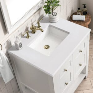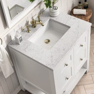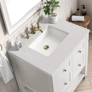 The Breckenridge 36″ Single Vanity Cabinet is a fresh take on traditional Mission furniture that easily transitions to Modern Farmhouse style with an air of understated sophistication. Champagne Brass knobs complement the Bright White finish, while the neatly inset door and drawer fronts lend a fresh appeal to this clean-lined classic.
