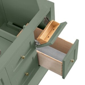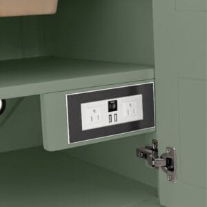 The Breckenridge 30″ Single Vanity Cabinet is a fresh take on traditional Mission furniture that easily transitions to Modern Farmhouse style with an air of understated sophistication. Champagne Brass knobs complement the Smokey Celadon finish, while the neatly inset door and drawer fronts lend a fresh appeal to this clean-lined classic. A two-door cabinet opens to reveal an interior shelf equipped with convenient built-in USB/120V power outlet. This console-style vanity also features an open lower shelf for additional storage. Complete the look with one of our 3 cm tops.