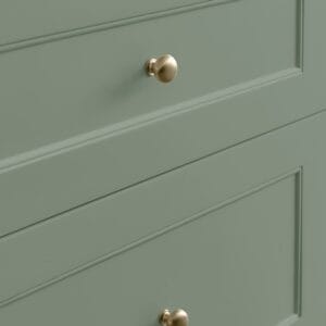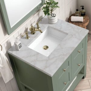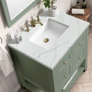 The Breckenridge 30″ Single Vanity Cabinet is a fresh take on traditional Mission furniture that easily transitions to Modern Farmhouse style with an air of understated sophistication. Champagne Brass knobs complement the Smokey Celadon finish, while the neatly inset door and drawer fronts lend a fresh appeal to this clean-lined classic.