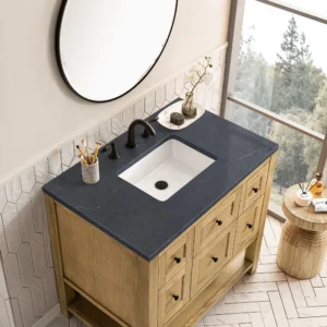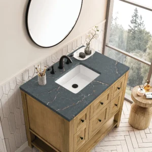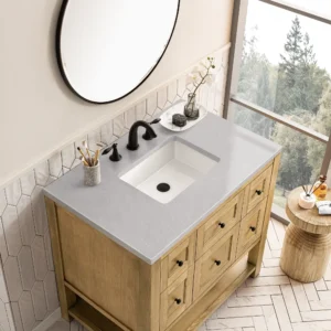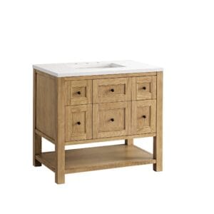 The Breckenridge 36″ Single Vanity by James Martin Vanities is a fresh take on traditional Mission furniture that easily transitions to Modern Farmhouse style with an air of understated sophistication. Matte Black knobs complement the Light Natural Oak finish, while the neatly inset door and drawer fronts lend a fresh appeal to this clean-lined classic.
