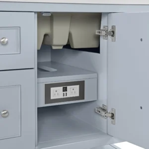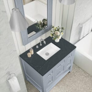 The Breckenridge 36″ Single Vanity by James Martin Vanities is a fresh take on traditional Mission furniture that easily transitions to Modern Farmhouse style with an air of understated sophistication. Satin Nickel knobs complement the Serenity Blue finish, while the neatly inset door and drawer fronts lend a fresh appeal to this clean-lined classic.
