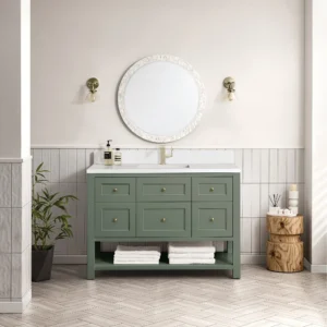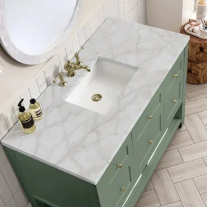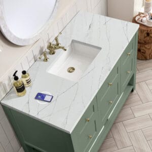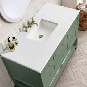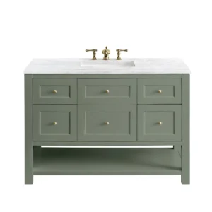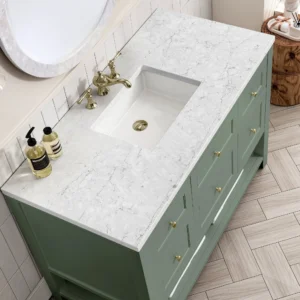 The Breckenridge 48″ Single Vanity by James Martin Vanities is a fresh take on traditional Mission furniture that easily transitions to Modern Farmhouse style with an air of understated sophistication. Champagne Brass knobs complement the Smokey Celadon finish, while the neatly inset door and drawer fronts lend a fresh appeal to this clean-lined classic.