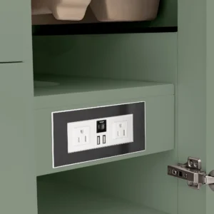 The Breckenridge 48″ Single Vanity by James Martin Vanities is a fresh take on traditional Mission furniture that easily transitions to Modern Farmhouse style with an air of understated sophistication. Champagne Brass knobs complement the Smokey Celadon finish, while the neatly inset door and drawer fronts lend a fresh appeal to this clean-lined classic. A single-door cabinet opens to reveal an interior shelf equipped with convenient built-in USB/120V power outlet. This console-style vanity also features four full-extension drawers and an open lower shelf for additional storage. Select one of our countertops to complete your vanity.