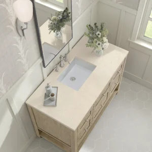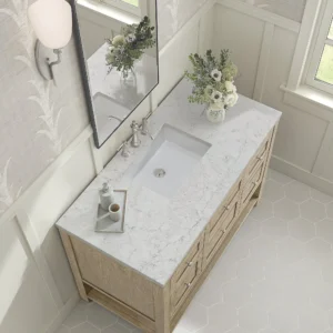 The Breckenridge 48″ Single Vanity by James Martin Vanities is a fresh take on traditional Mission furniture that easily transitions to Modern Farmhouse style with an air of understated sophistication. Satin Nickel knobs complement the Whitewashed Oak finish, while the neatly inset door and drawer fronts lend a fresh appeal to this clean-lined classic.