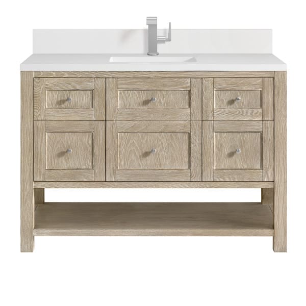 The Breckenridge 48″ Single Vanity by James Martin Vanities is a fresh take on traditional Mission furniture that easily transitions to Modern Farmhouse style with an air of understated sophistication. Satin Nickel knobs complement the Whitewashed Oak finish, while the neatly inset door and drawer fronts lend a fresh appeal to this clean-lined classic. A single-door cabinet opens to reveal an interior shelf equipped with convenient built-in USB/120V power outlet. This console-style vanity also features four full-extension drawers and an open lower shelf for additional storage. Select one of our countertops to complete your vanity.