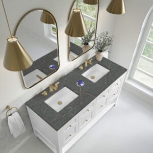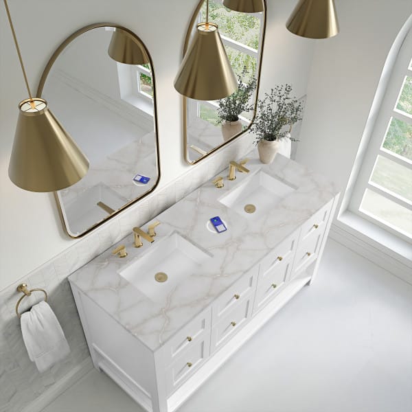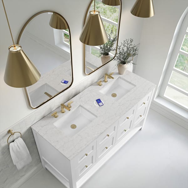 The Breckenridge 60″ Double Vanity by James Martin Vanities is a fresh take on traditional Mission furniture that easily transitions to Modern Farmhouse style with an air of understated sophistication. Champagne Brass knobs complement the Bright White finish, while the neatly inset door and drawer fronts lend a fresh appeal to this clean-lined classic.