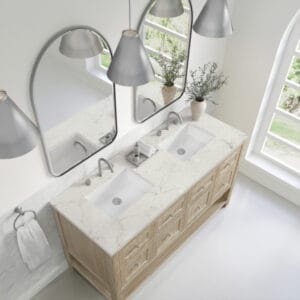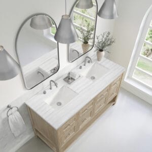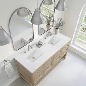 The Breckenridge 60″ Double Vanity by James Martin Vanities is a fresh take on traditional Mission furniture that easily transitions to Modern Farmhouse style with an air of understated sophistication. Satin Nickel knobs complement the Whitewashed Oak finish, while the neatly inset door and drawer fronts lend a fresh appeal to this clean-lined classic.