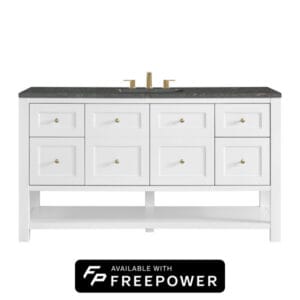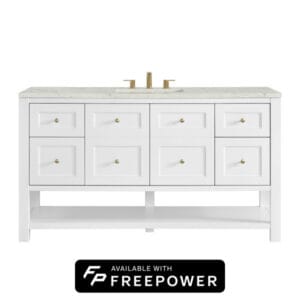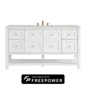 The Breckenridge 60″ Single Vanity by James Martin Vanities is a fresh take on traditional Mission furniture that easily transitions to Modern Farmhouse style with an air of understated sophistication. Champagne Brass knobs complement the Bright White finish, while the neatly inset door and drawer fronts lend a fresh appeal to this clean-lined classic. A two-door cabinet opens to reveal an interior shelf equipped with convenient built-in USB/120V power outlet. This console-style vanity also features four full-extension drawers and an open lower shelf for additional storage. Complete the look with one of our 3 cm tops.