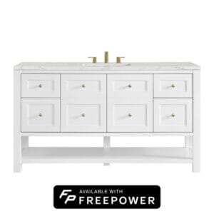 The Breckenridge 60″ Single Vanity by James Martin Vanities is a fresh take on traditional Mission furniture that easily transitions to Modern Farmhouse style with an air of understated sophistication. Champagne Brass knobs complement the Bright White finish, while the neatly inset door and drawer fronts lend a fresh appeal to this clean-lined classic.