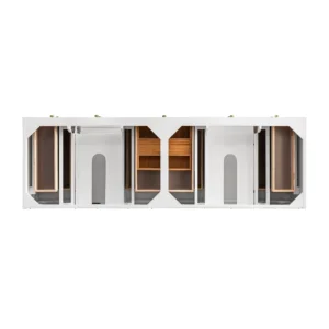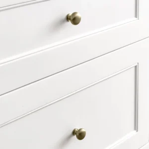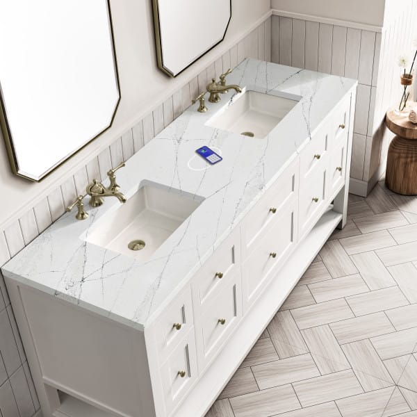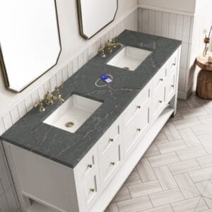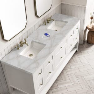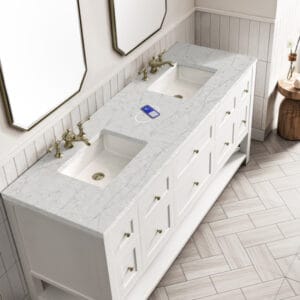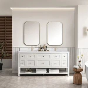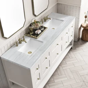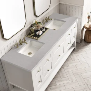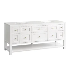 The Breckenridge 72″ Double Vanity Cabinet is a fresh take on traditional Mission furniture that easily transitions to Modern Farmhouse style with an air of understated sophistication. Champagne Brass knobs complement the Bright White finish, while the neatly inset door and drawer fronts lend a fresh appeal to this clean-lined classic.