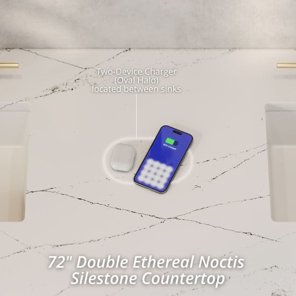 The Breckenridge 72″ Double Vanity Cabinet is a fresh take on traditional Mission furniture that easily transitions to Modern Farmhouse style with an air of understated sophistication. Champagne Brass knobs complement the Bright White finish, while the neatly inset door and drawer fronts lend a fresh appeal to this clean-lined classic. Two single-door cabinets open to reveal interior shelves equipped with a convenient built-in USB/120V power outlet. This console-style vanity also features six full-extension drawers and an open lower shelf for additional storage. Complete the look with one of our 3 cm tops.