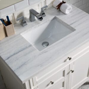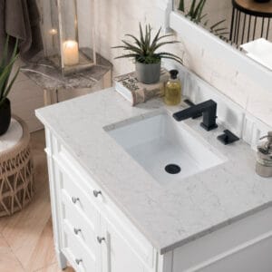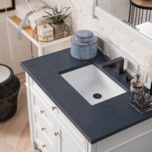 The 36″ Brittany Single vanity in Bright White by James Martin Vanities, features optimal organization with one hide-away tip-out drawer plus two side drawers, Brittany wood vanity can complement a variety of decors and is a sophisticated vanity solution for your small bathroom.