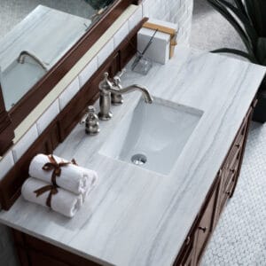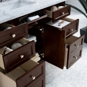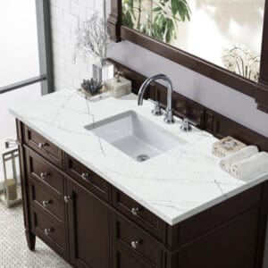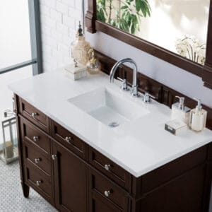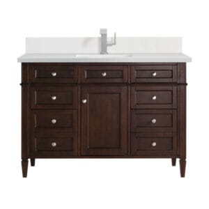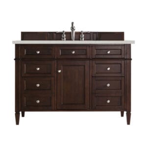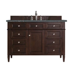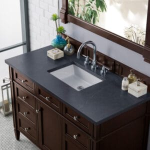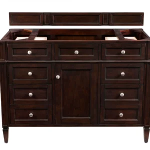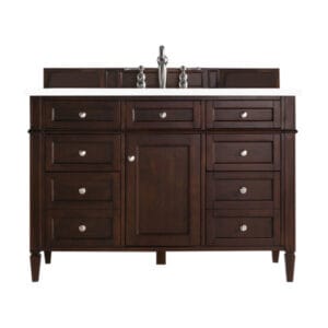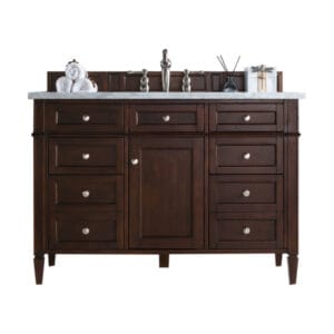 The 48″ Brittany Single vanity in Burnished Mahogany by James Martin Vanities, features optimal organization with one hide-away tip-out drawer plus two side drawers, Brittany wood vanity can complement a variety of decors and is a sophisticated vanity solution for your small bathroom.
