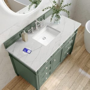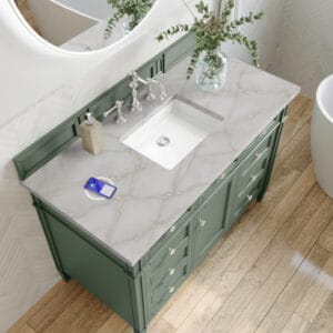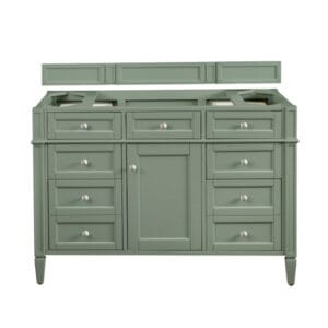 The 48″ Brittany Single vanity in Smokey Celadon by James Martin Vanities, features optimal organization with one hide-away tip-out drawer plus two side drawers, Brittany wood vanity can complement a variety of decors and is a sophisticated vanity solution for your small bathroom.
