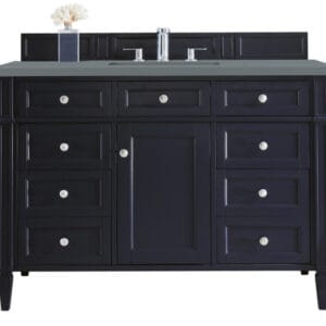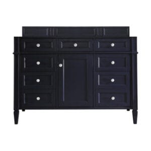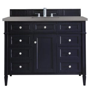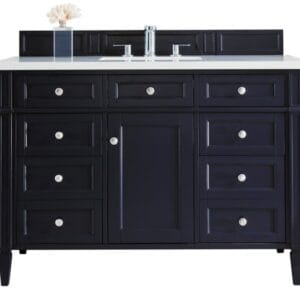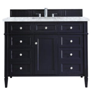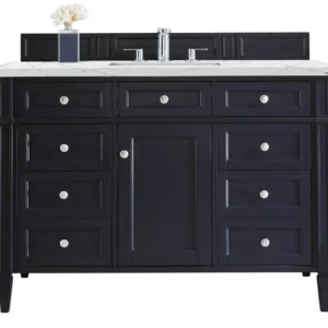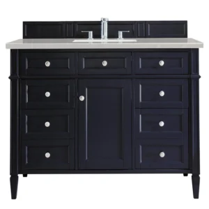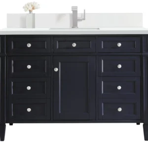 The 48″ Brittany Single vanity in Victory Blue, by James Martin Vanities, features optimal organization with one hide-away tip-out drawer plus two side drawers, Brittany wood vanity can complement a variety of decors and is a sophisticated vanity solution for your small bathroom.