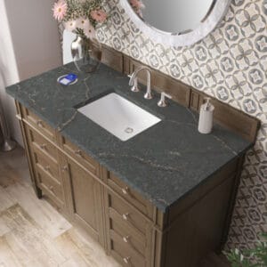 The 48″ Brittany Single vanity in Saddle Brown, by James Martin Vanities, features optimal organization with one hide-away tip-out drawer plus two side drawers, Brittany wood vanity can complement a variety of decors and is a sophisticated vanity solution for your small bathroom.
