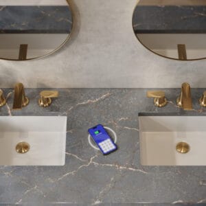 The 60″ Brittany Double Vanity cabinet in Urban Gray, by James Martin Vanities, with decorative wood backsplash, features optimal organization with two hide-away tip-out drawers plus four center drawers. This cabinet also has two doors, each concealing an interior shelf. All drawers are lined with an aluminum laminate surface for easy cleaning and are equipped with undermount soft-close slides.