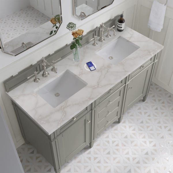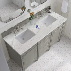 The 60″ Brittany Double Vanity cabinet in Urban Gray, by James Martin Vanities, with decorative wood backsplash, features optimal organization with two hide-away tip-out drawers plus four center drawers, a sophisticated vanity solution for your bathroom.