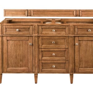 The 60″ Brittany Double Vanity cabinet in Saddle Brown, by James Martin Vanities, with decorative wood backsplash, features optimal organization with two hide-away tip-out drawers plus four center drawers, a sophisticated vanity solution for your bathroom.