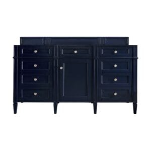 The 60″ Brittany single vanity cabinet in Black Onyx, by James Martin Vanities, features optimal organization with one hide-away tip-out drawer plus six side drawers, two of which are double height for storing taller items. This cabinet also has one door, which conceals an interior shelf. All drawers are lined with an aluminum laminate surface for easy cleaning and are equipped with undermount soft-close slides. Decorative wood backsplash is included for added style.
