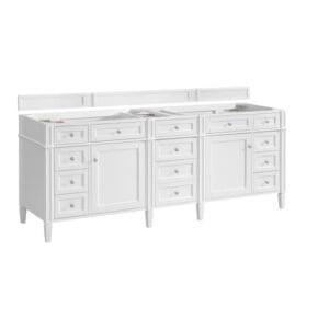 The Bright White finish on the 84″ Double Sink Brittany Vanity brings the rich, timeless details of the Brittany collection to life. The 84″ Brittany Vanity by James Martin Vanities features optimal organization with two hide-away tip-out drawers plus eleven drawers, a sophisticated vanity solution for your bathroom.