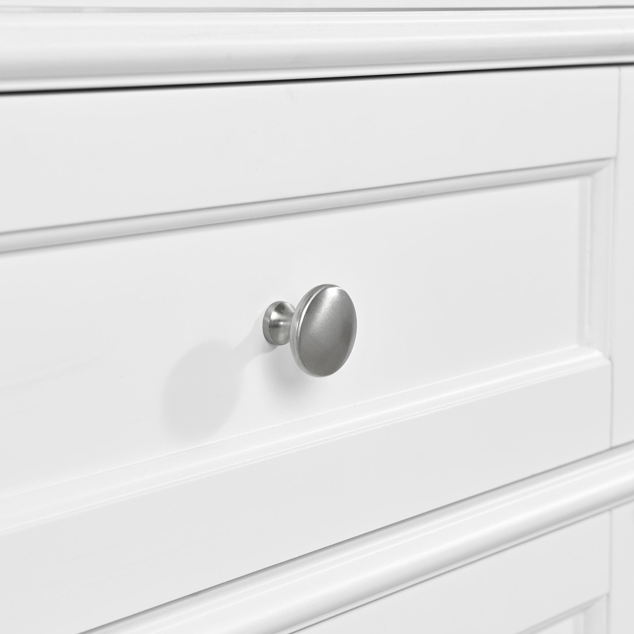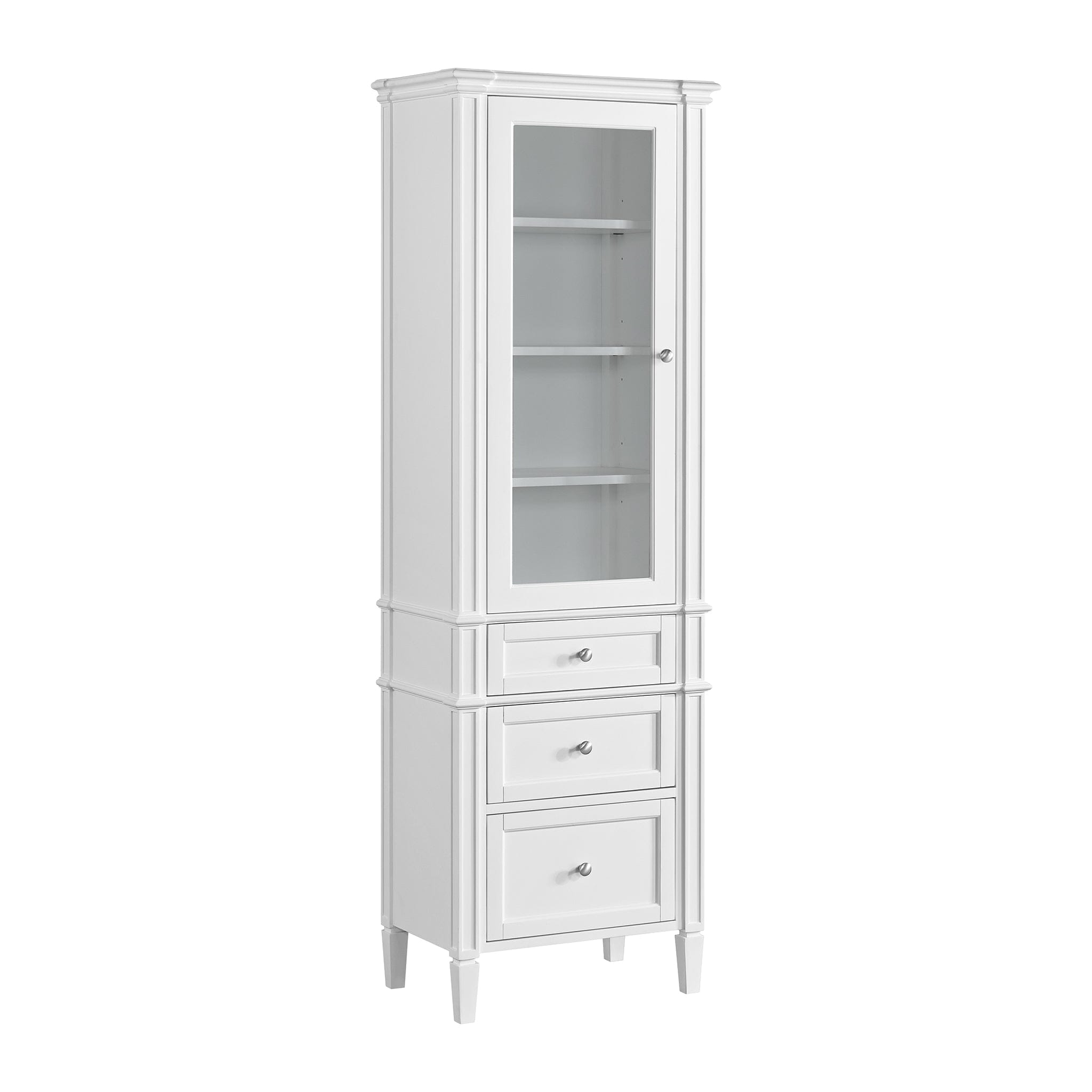 Designed to match our Brittany bathroom vanities, our Brittany Linen Cabinet with Reversible Door is offered in a Bright White finish and features the recognizable tapered legs and classic Brushed Nickel hardware of the Brittany Collection. This linen cabinet offers an incredible amount of flexible storage designed to meet your needs. The clear glass-paned door opens to three adjustable shelves, allowing you to display your organized bathroom essentials. The reversible door allows for customized installation for your space – either left or right opening. Three full-extension drawers feature soft-close undermount drawer slides and our signature brushed-aluminum laminate for easy cleaning. Bring the Brittany Linen Cabinet home as the perfect complement to your Brittany vanity or allow its traditional design to shine as a standalone piece.