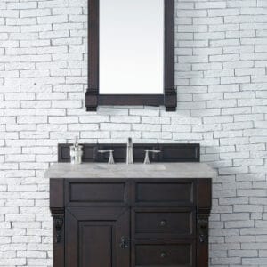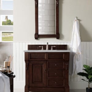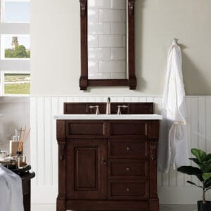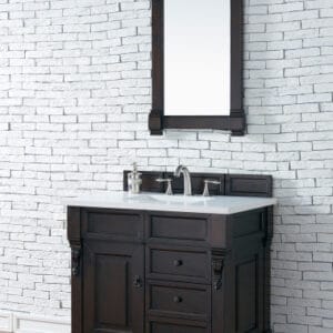 Heirloom-inspired, the Brookfield 36” single vanity in Burnished Mahogany, by James Martin Vanities, showcases hand-carved detailing and raised panel doors. One door opens to shelves for storage below, a sophisticated vanity solution for your Small bathroom.