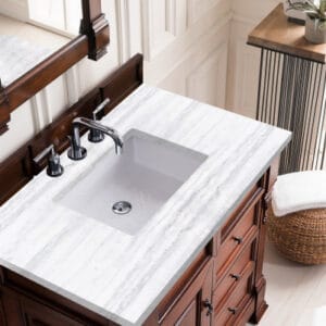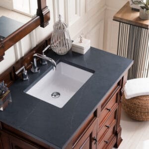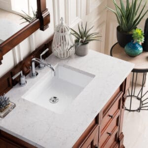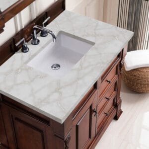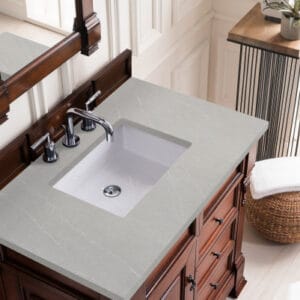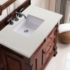 Heirloom-inspired, the Brookfield 36” single vanity in Warm Cherry, by James Martin Vanities, showcases hand-carved detailing and raised panel doors. One door opens to shelves for storage below, a sophisticated vanity solution for your Small bathroom.