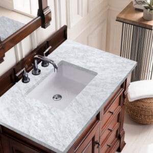 Heirloom-inspired, the Brookfield 36” single vanity in Warm Cherry, by James Martin Vanities, showcases hand-carved detailing and raised panel doors. One door opens to shelves for storage below. Two drawers made up of a lower double-height drawer and a middle standard drawer offer additional storage space. This collection is a modern vanity with sophisticated vintage appeal. Available with any of our 3 cm tops and a rectangular undermount porcelain sink.
