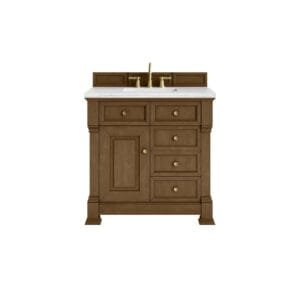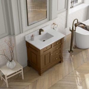The Brookfield 36″ Single Vanity in Honey Oak by James Martin Vanities offers a blend of traditional elegance and contemporary sophistication. The raised panel picture frame doors and detailed corner molding reflect timeless craftsmanship, while the Honey Oak vanity finish and Champagne Brass hardware lend a fresh, modern appeal. T