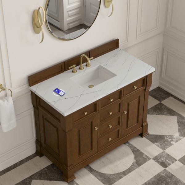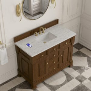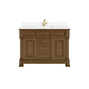 The Brookfield 48″ Single Vanity in Honey Oak, by James Martin Vanities, offers a blend of traditional elegance and contemporary sophistication. The raised panel picture frame doors and detailed corner molding reflect timeless craftsmanship, while the rich vanity finish and Champagne Brass hardware lend a fresh, modern appeal.