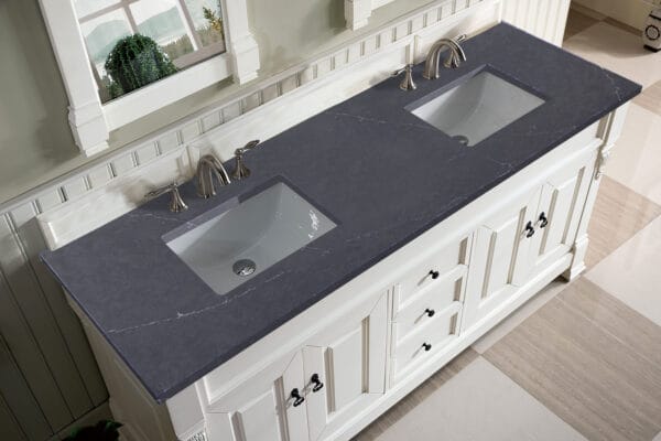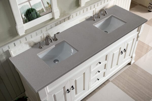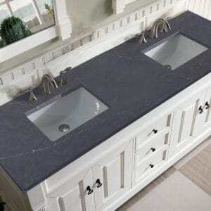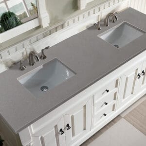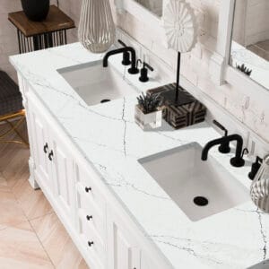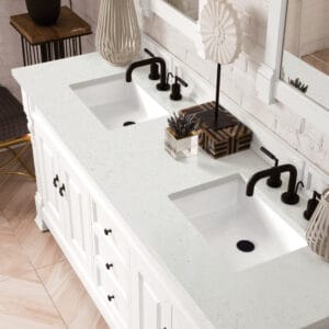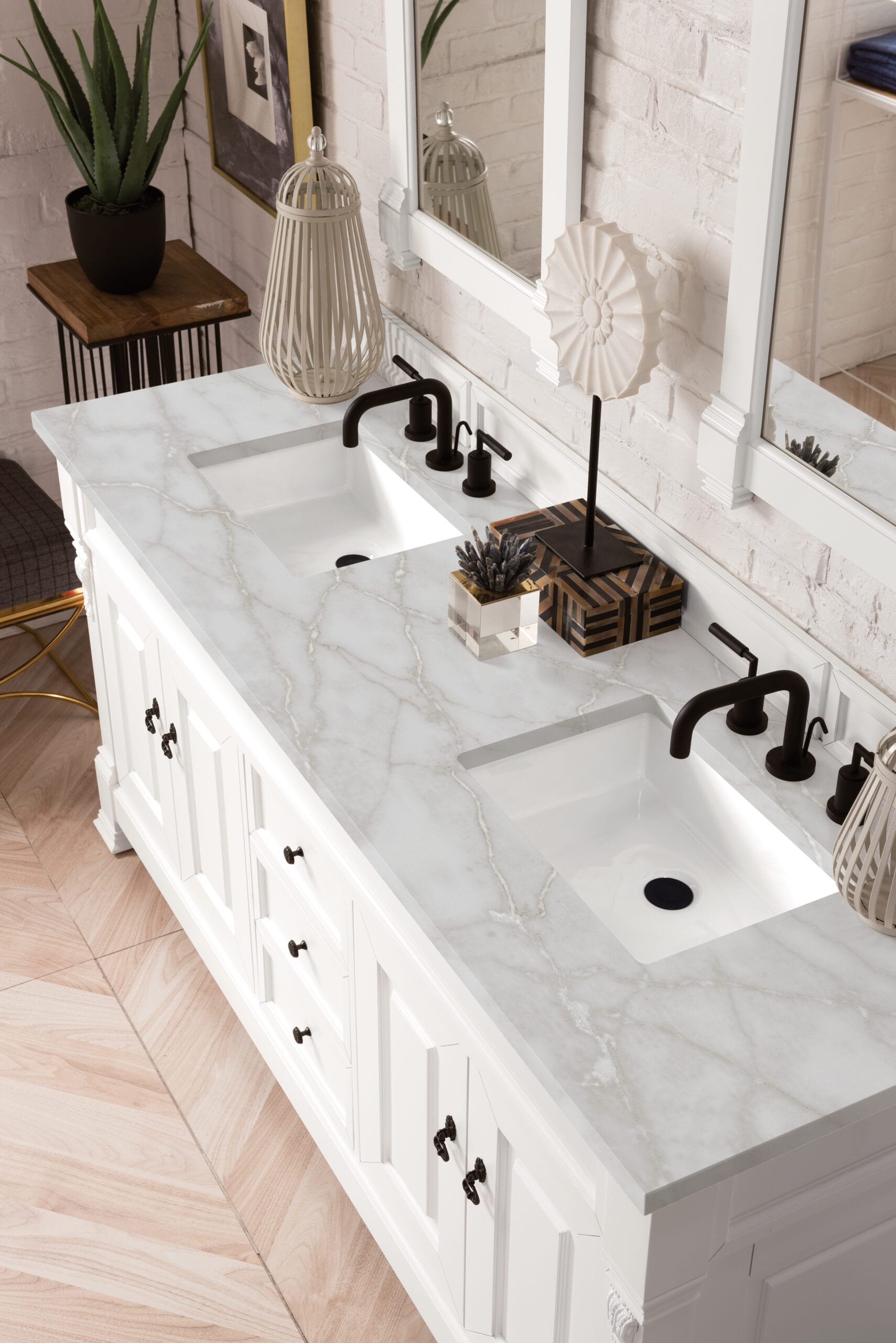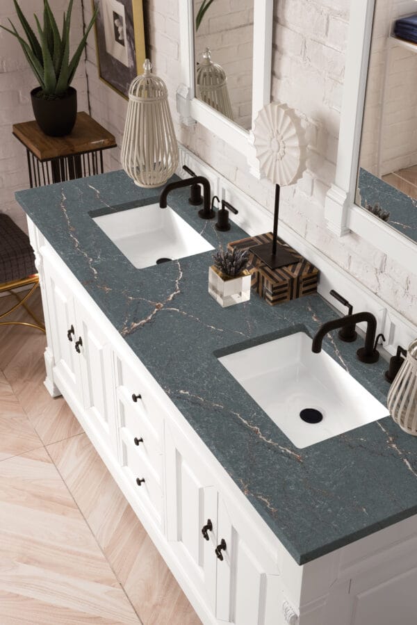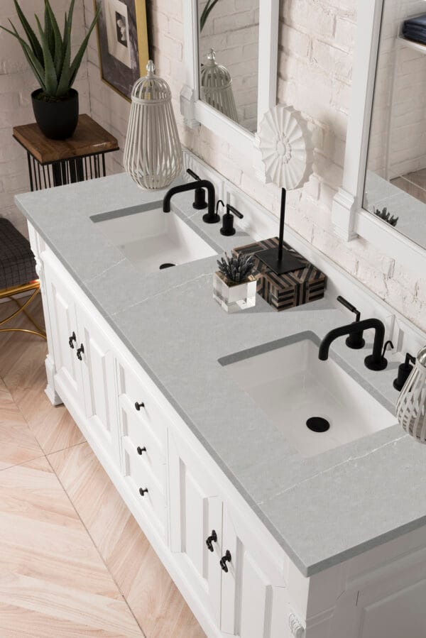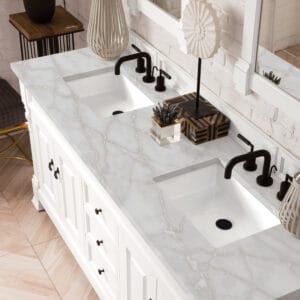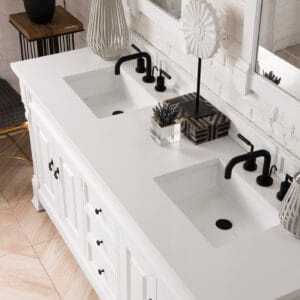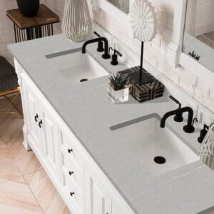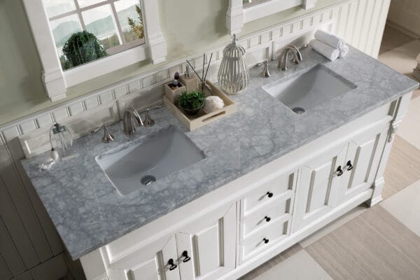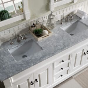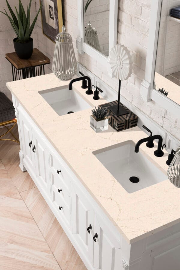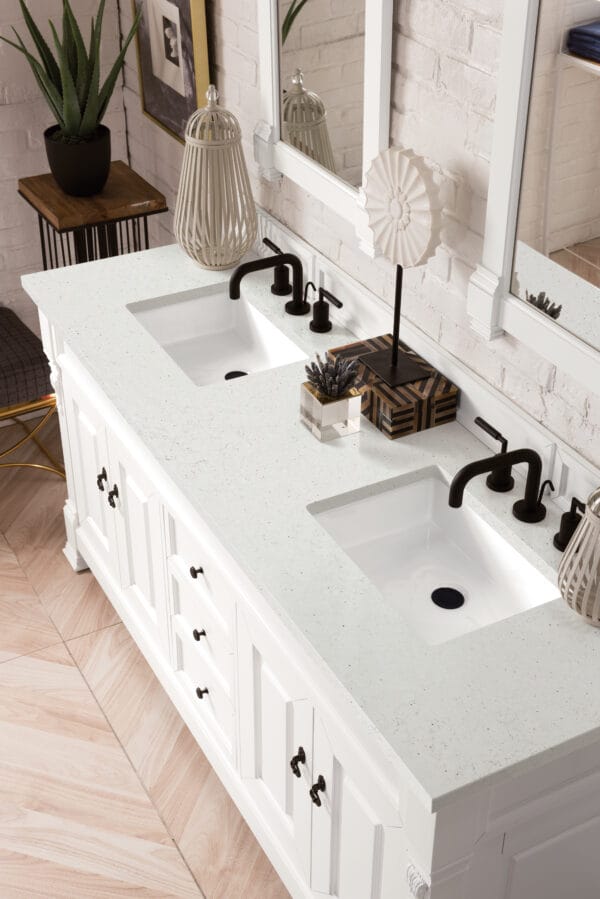 Heirloom-inspired, the Brookfield 60” Double vanity in Bright White, by James Martin Vanities, showcases hand-carved detailing and raised panel doors. Two doors on either side, open to shelves for storage below, a sophisticated vanity solution for your Small bathroom.
