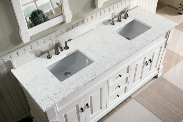 Heirloom-inspired, the Brookfield 60” double vanity in Bright White, by James Martin Vanities, showcases hand-carved detailing and raised panel doors. Two doors on either side, open to shelves for storage below. Three center drawers, made up of a lower double-height drawer and both middle and top short-length standard drawers, offer additional storage space. This collection is a modern vanity with sophisticated vintage appeal. Available with any of our 3 cm top options, and a rectangular undermount porcelain sink.