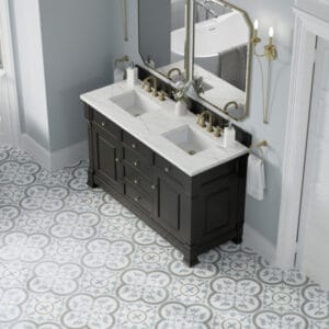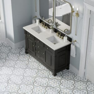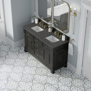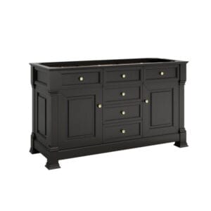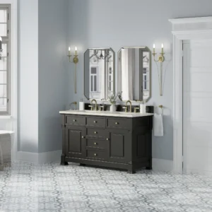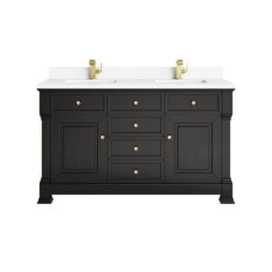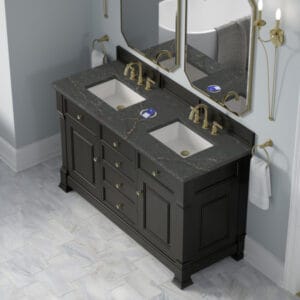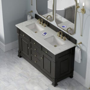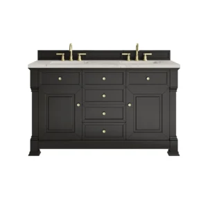 The Brookfield 60″ Double Vanity in Black Onyx, by James Martin Vanities, offers a blend of traditional elegance and contemporary sophistication. The raised panel picture frame doors and detailed corner molding reflect timeless craftsmanship, while the rich vanity finish and Champagne Brass hardware lend a fresh, modern appeal.