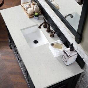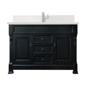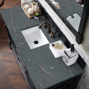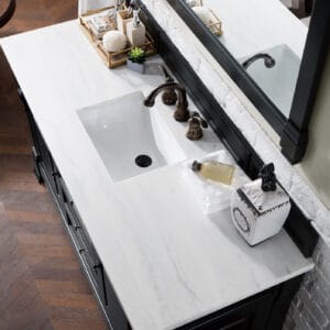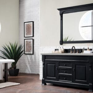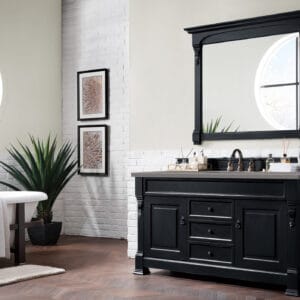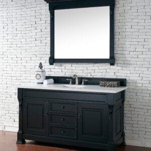 Heirloom-inspired, the Brookfield 60” single vanity in Antique Black, by James Martin Vanities, showcases hand-carved detailing and raised panel doors. Two doors on either side, open to shelves for storage below, a sophisticated vanity solution for your Small bathroom.
