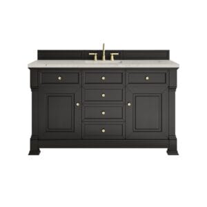 The Brookfield 60″ Single Vanity in Black Onyx, by James Martin Vanities, offers a blend of traditional elegance and contemporary sophistication. The raised panel picture frame doors and detailed corner molding reflect timeless craftsmanship, while the rich vanity finish and Champagne Brass hardware lend a fresh, modern appeal. This beautifully crafted vanity features a two-door cabinet which opens to interior shelves, and 3 standard drawers for ample storage. The timeless Black Onyx finish lends sophistication and charm to your space. Select one of our countertops to complete your vanity.