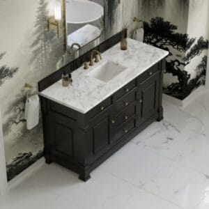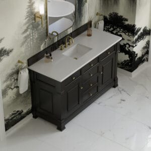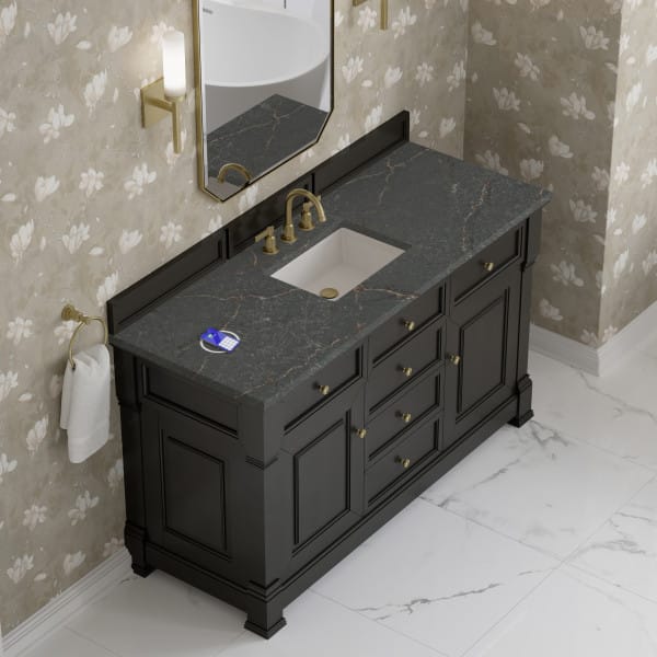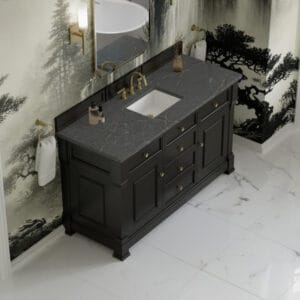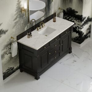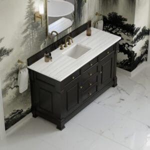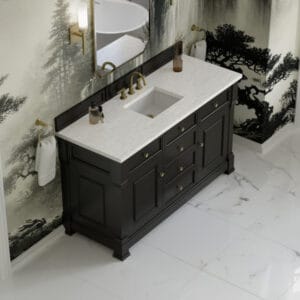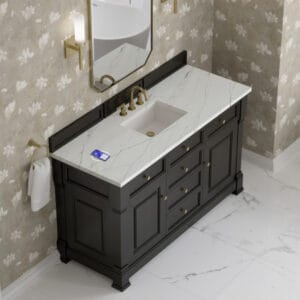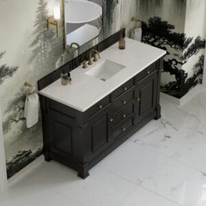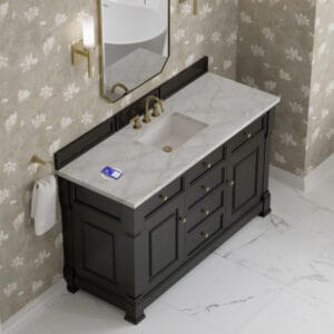 The Brookfield 60″ Single Vanity in Black Onyx, by James Martin Vanities, offers a blend of traditional elegance and contemporary sophistication. The raised panel picture frame doors and detailed corner molding reflect timeless craftsmanship, while the rich vanity finish and Champagne Brass hardware lend a fresh, modern appeal.