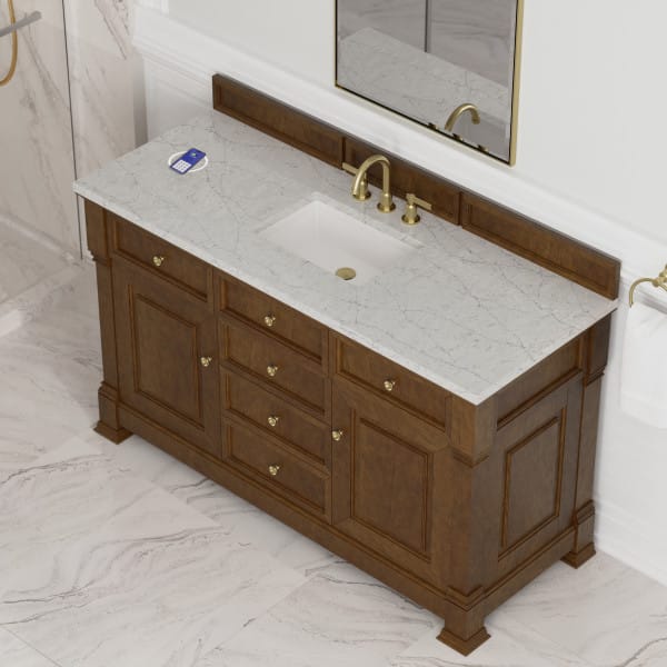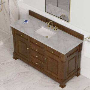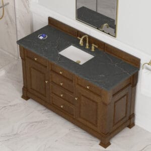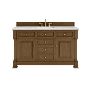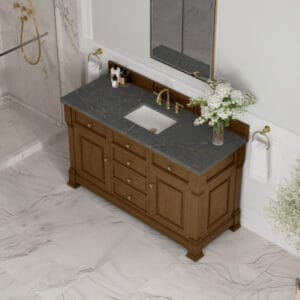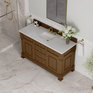 The Brookfield 60″ Single Vanity in Honey Oak by James Martin Vanities offers a blend of traditional elegance and contemporary sophistication. The raised panel picture frame doors and detailed corner molding reflect timeless craftsmanship, while the Honey Oak vanity finish and Champagne Brass hardware lend a fresh, modern appeal.