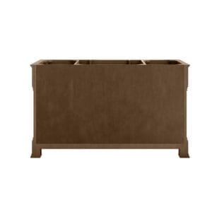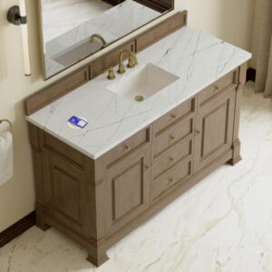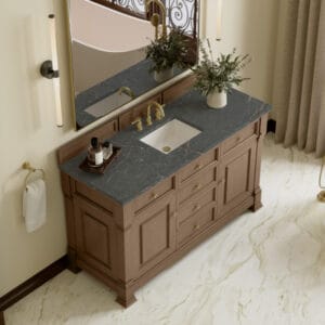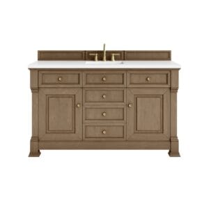 The Brookfield 60″ Single Vanity in Pecan, by James Martin Vanities, offers a blend of traditional elegance and contemporary sophistication. The raised panel picture frame doors and detailed corner molding reflect timeless craftsmanship, while the Pecan vanity finish and Champagne Brass hardware lend a fresh, modern appeal. This beautifully crafted vanity features a two-door cabinet which opens to interior shelves, and 3 standard drawers for ample storage. The cool wood tones showcase the natural Oak wood grains, lending sophistication and charm to your space. Select one of our 3 cm tops to complete the vanity.