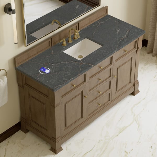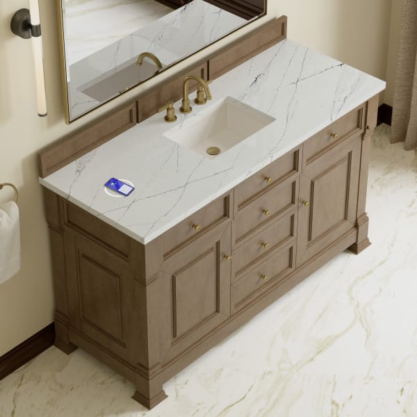 The Brookfield 60″ Single Vanity in Pecan, by James Martin Vanities, offers a blend of traditional elegance and contemporary sophistication. The raised panel picture frame doors and detailed corner molding reflect timeless craftsmanship, while the Pecan vanity finish and Champagne Brass hardware lend a fresh, modern appeal.